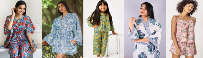 in hand block print clothing line we specially offering cotton vintage block printing clothes for our customers. We use best quality woven fabrics for casual and pyjama set. Our product range in block print clothing is western wear, ladies top, kids wear, womens night wears. We make 100 % cotton composition of woven fabric with organic cotton.